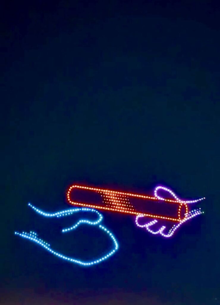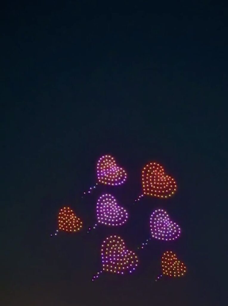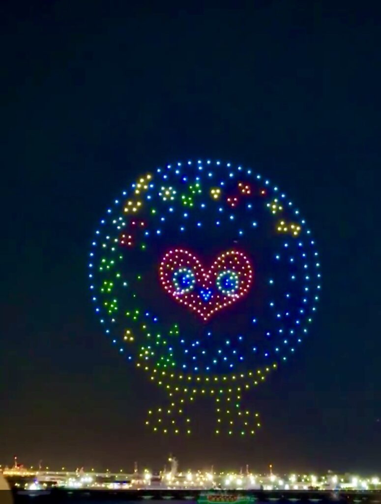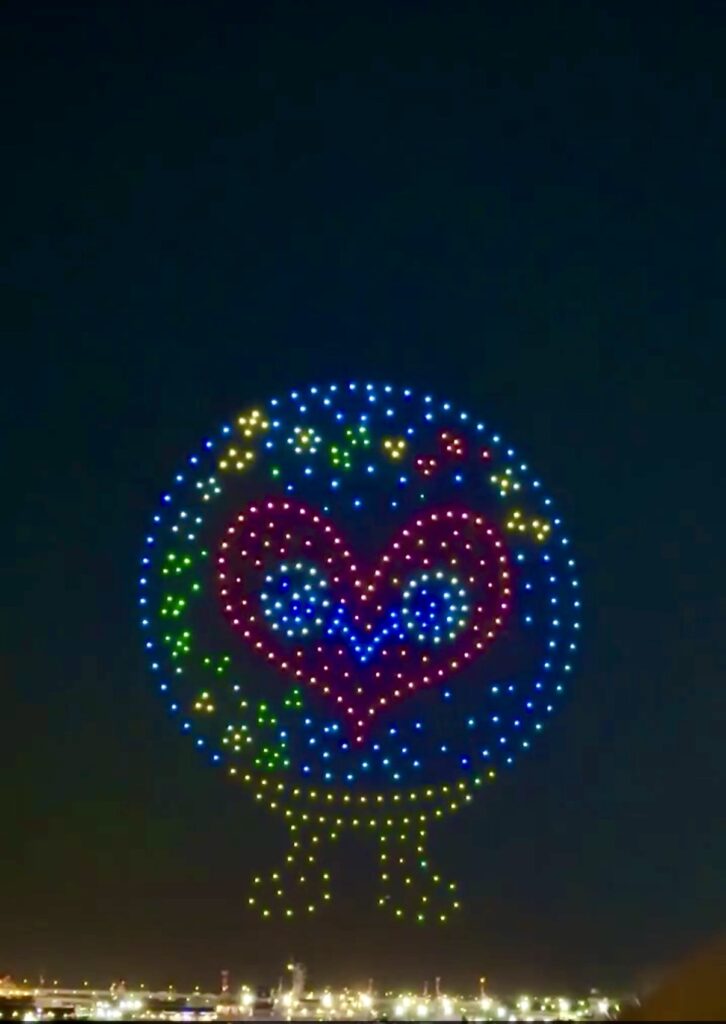 実はこの1週間前にも行われていて、今回は2回目の開催でした。大阪万博でミャクミャクのドローンショーを見ることができなかったので感激ひとしお・+(*゜∀゜*)+・; :*:・。,☆゚’・:*:・。、まずはミャクミャク登場です。重たいので動画はいくつかに分割しています。